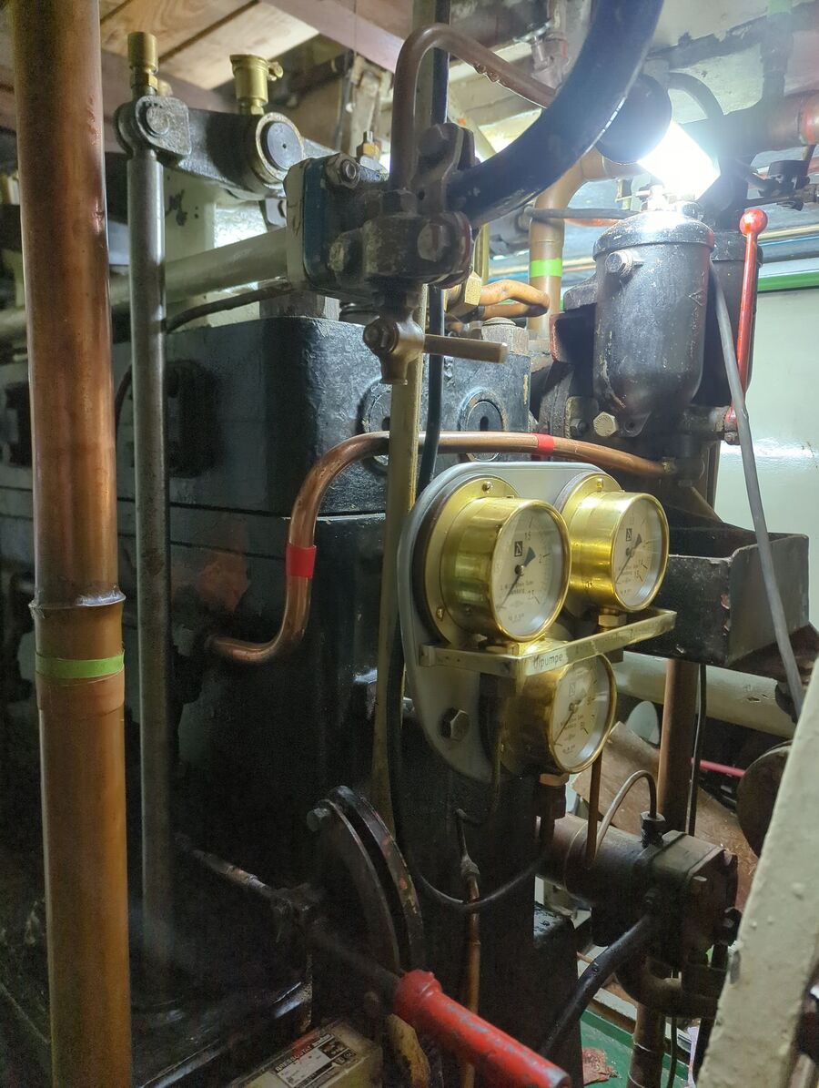 Über den Kompressor am Hilfsdiesel füllten wir die Anlassluftflasche und starteten mit der Druckluft die Hauptmaschine, die gleich zündete und rund lief. Dieser Betrieb war nun der erste in Eigenregie und der dritte seit der Vereinsgründung. Der Motor scheint die lange Standzeit gut überstanden zu haben.
