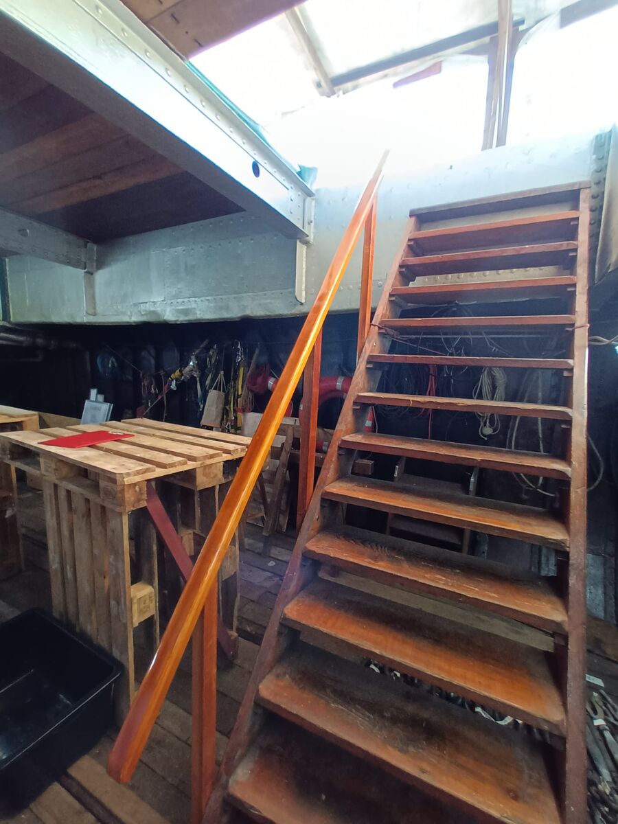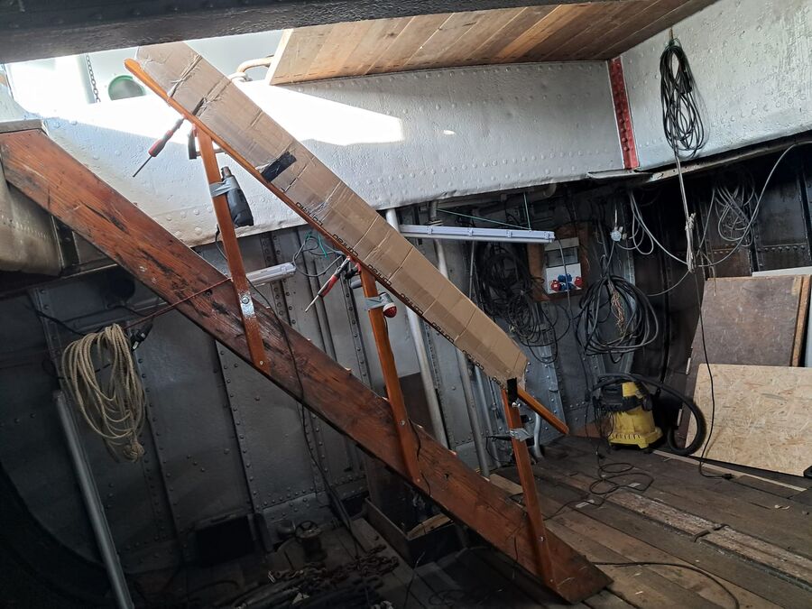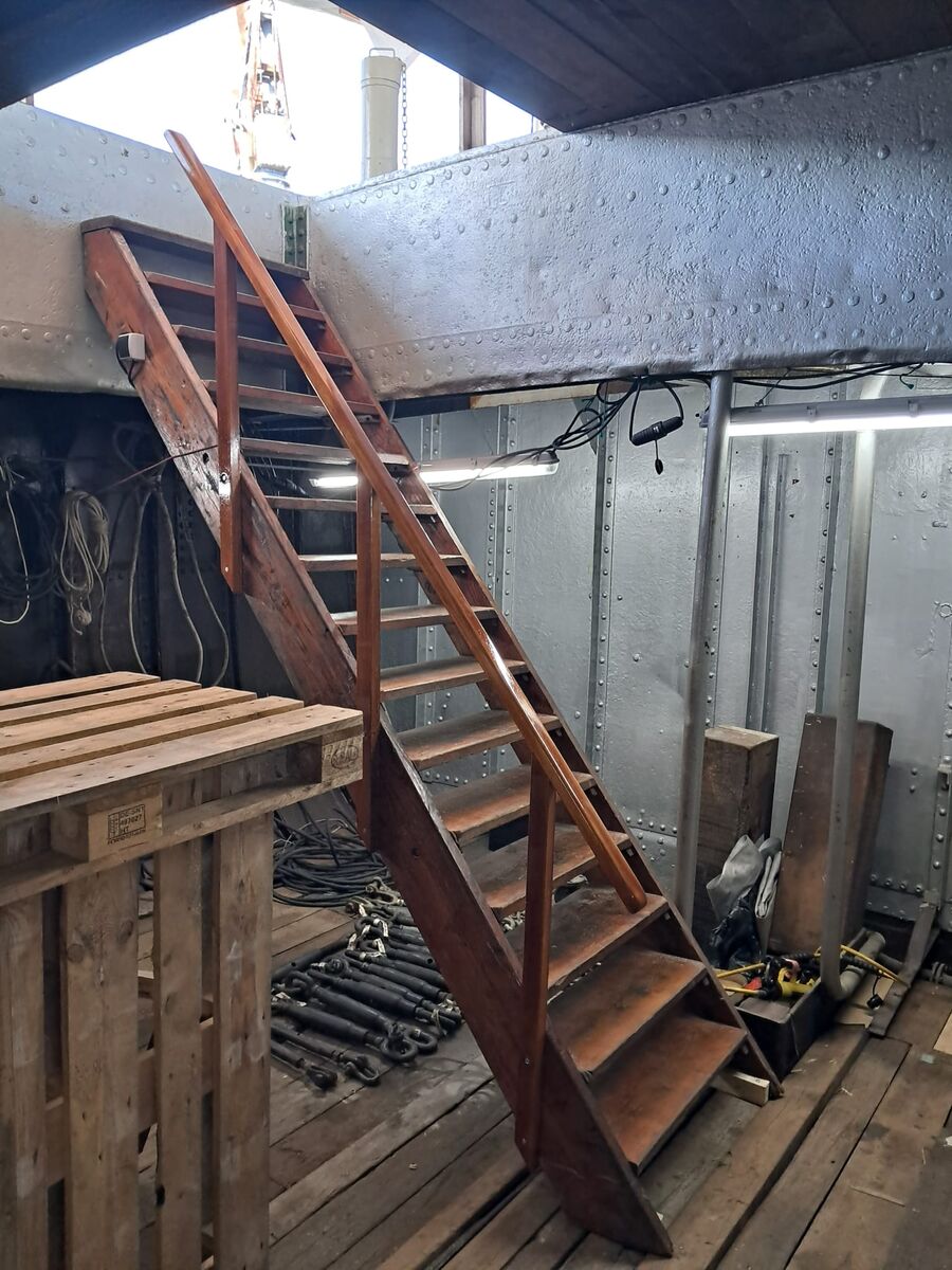 Nachdem im letzten Jahr bereits die Treppe in den Laderaum installiert wurde, ist jetzt nun auch die Sicherheit wieder hergestellt. Das Treppengeländer, neu gebaut aus Fichte, frisch lasiert und verklebtem Handlauf, wurde installiert und gewährleistet nun wieder den sicheren Zugang in den Laderaum.