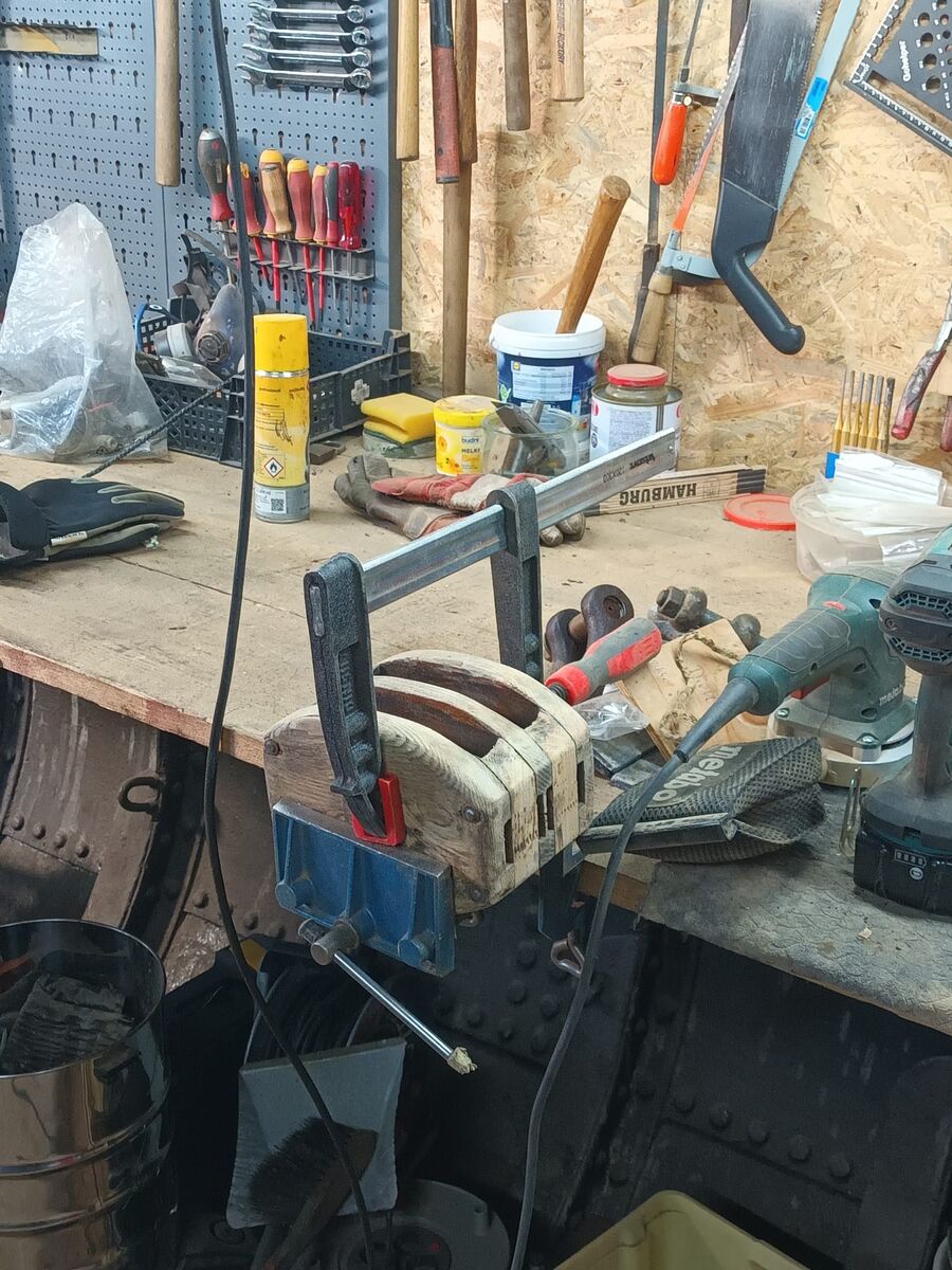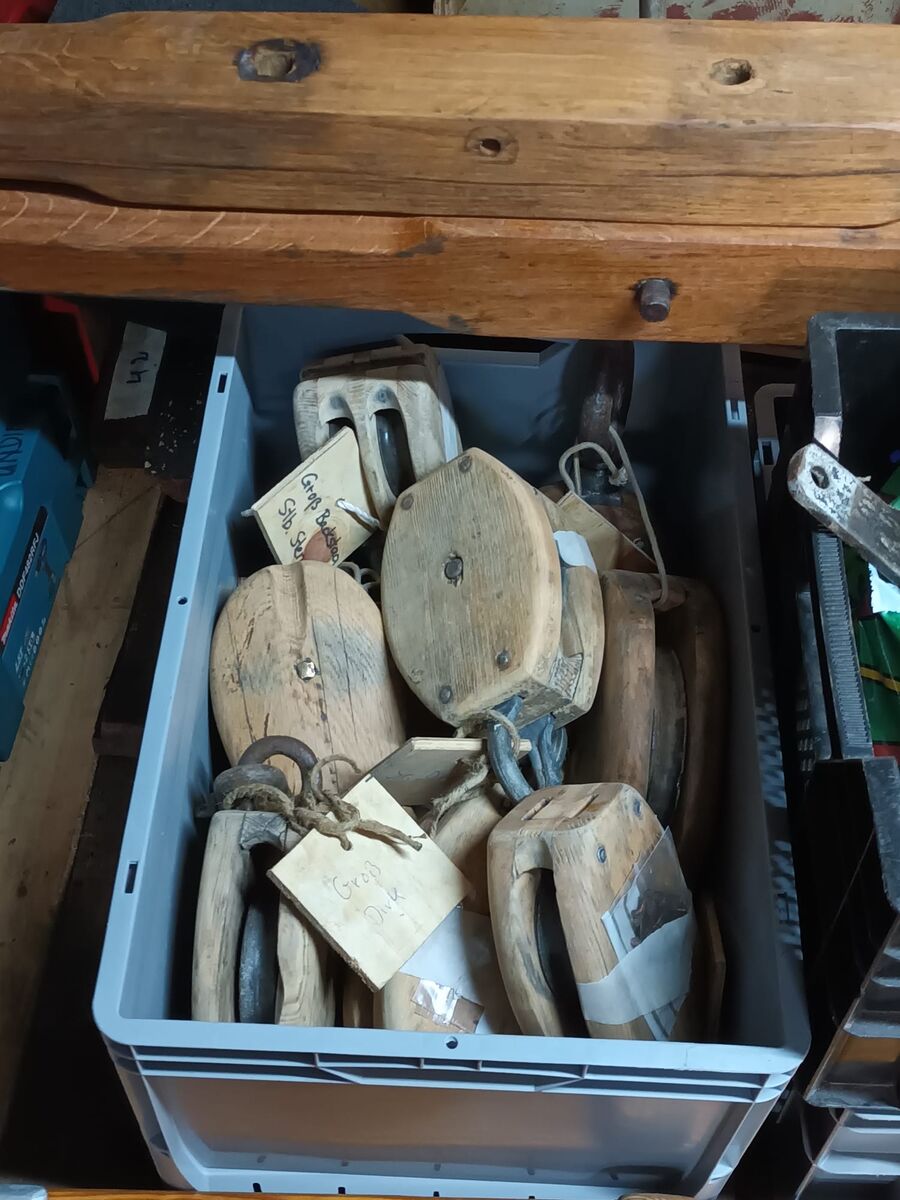 Unser inoffizieller "Bordtischler" ist unermütlich dabei, sich um diverse Holzarbeiten an Bord zu kümmern. Neben der bereits im letzten Blog erwähnten Arbeit an den Skylights werden Blöcke aus unserem Rigg von alten Lack- und Farbschichten befreit und warten nun auf eine neue Konservierung.