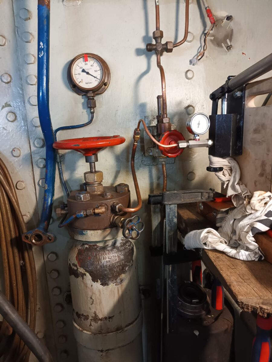 Die Anlass-Druckluftflaschen, die neulich einer Druckprüfung erfolgreich standgehalten haben, sind wieder am dafür vorgesehenen Platz installiert, angeschlossen und vom bordeigenem Kompressor mit 30 bar befüllt.